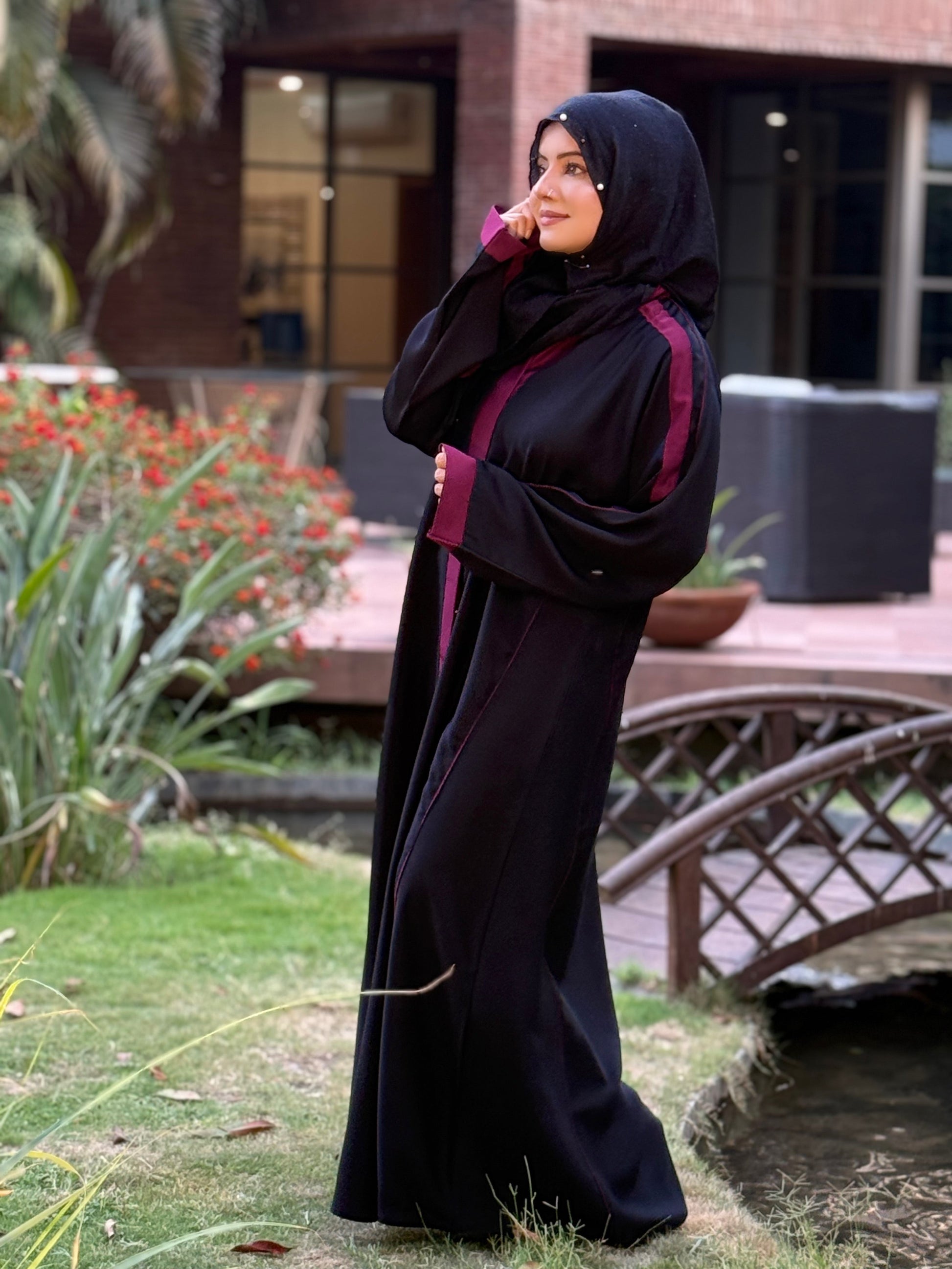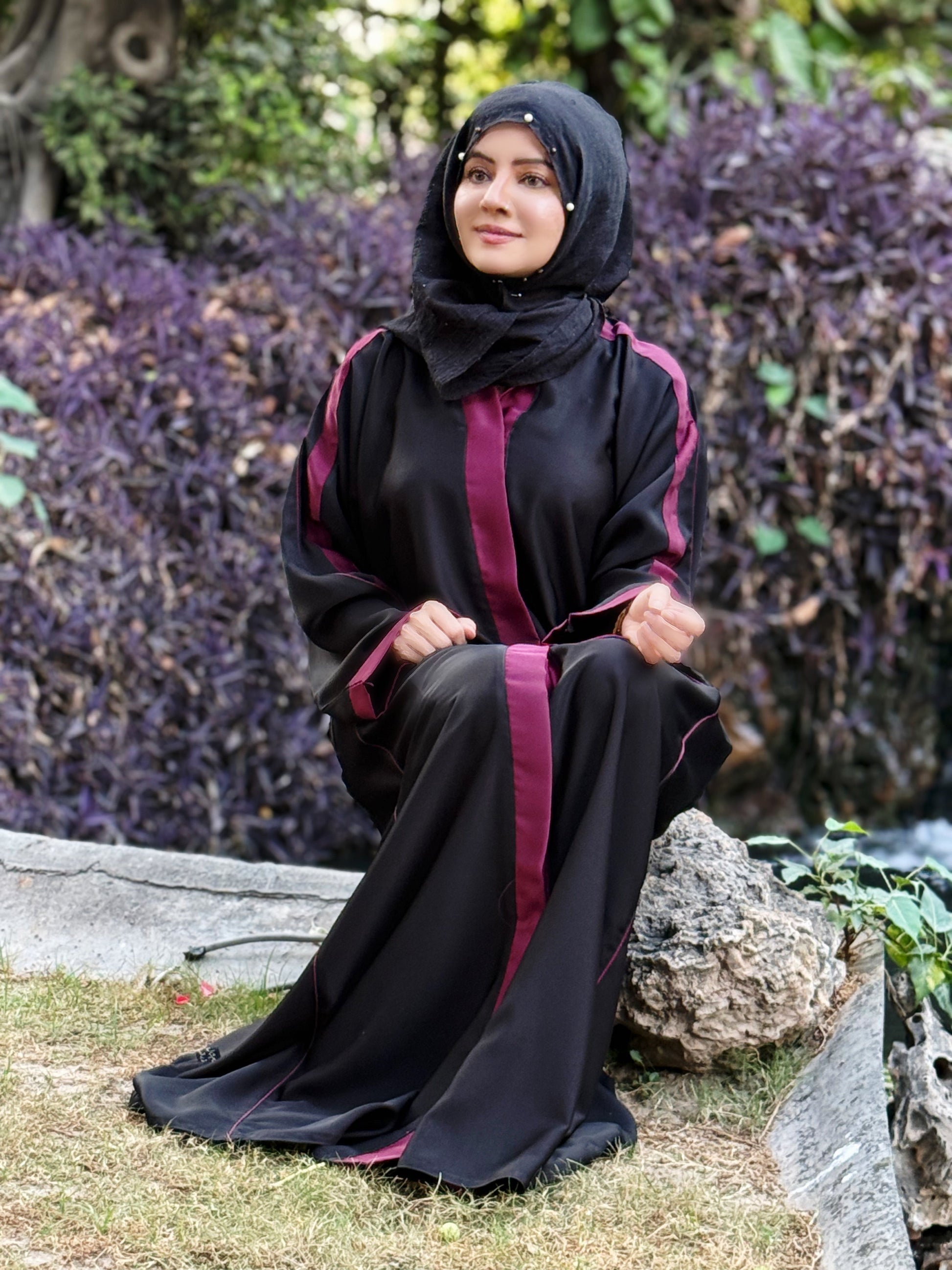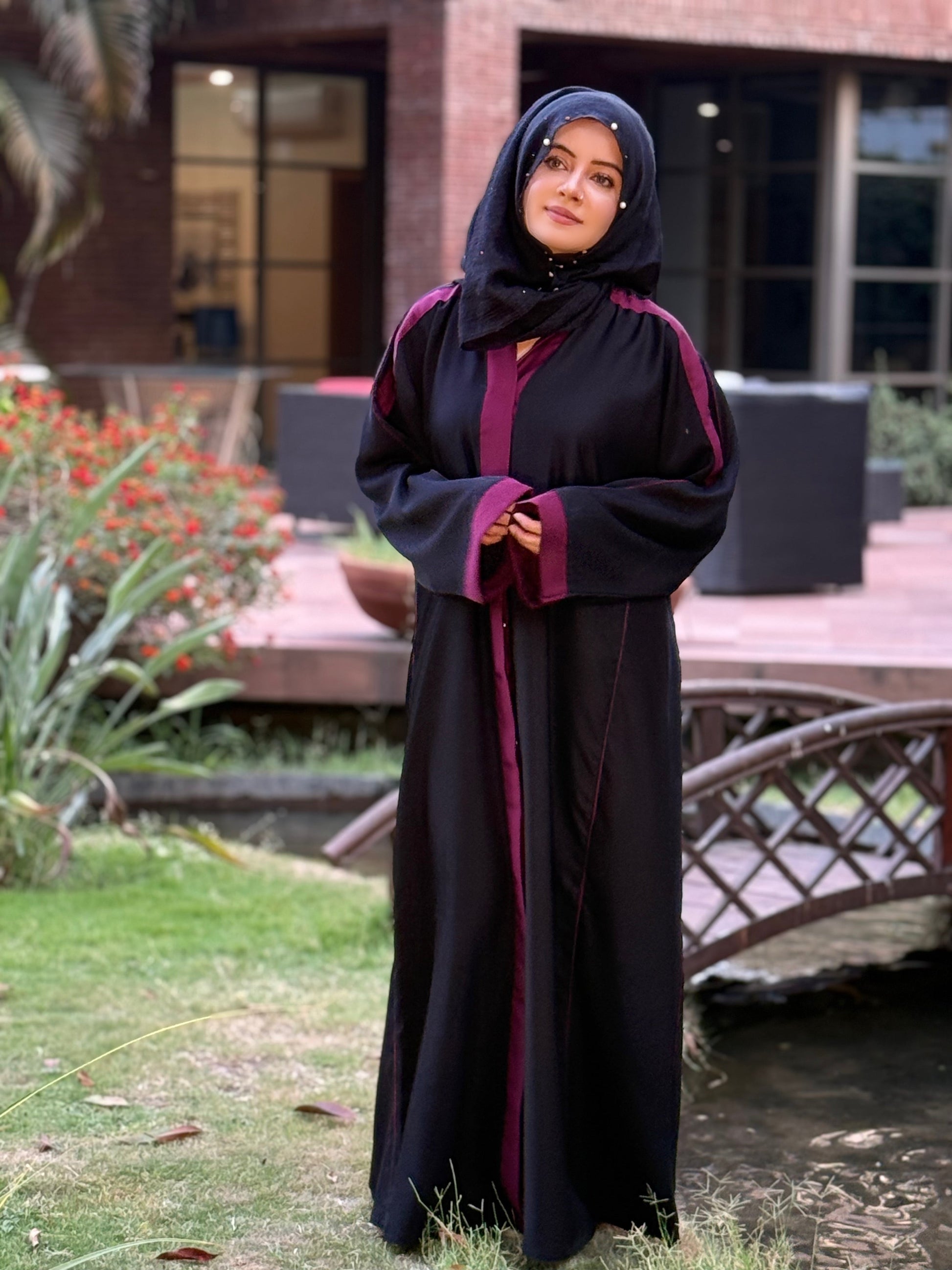 Black Abaya with Maroon Contrast Detailing – Bold Elegance by Haya by Rabi